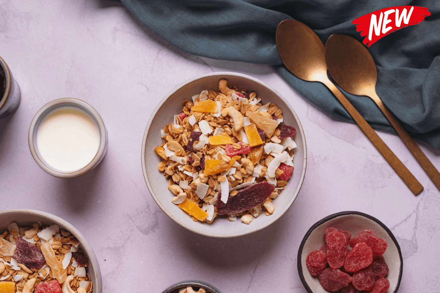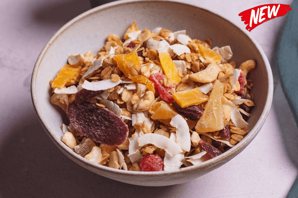 Flakes from six types of cereal, with mango, pineapple, cashews, strawberry, and coconut flakes. An exotic, fruit-forward blend, ideal for pairing with yogurt or your favorite drinks.